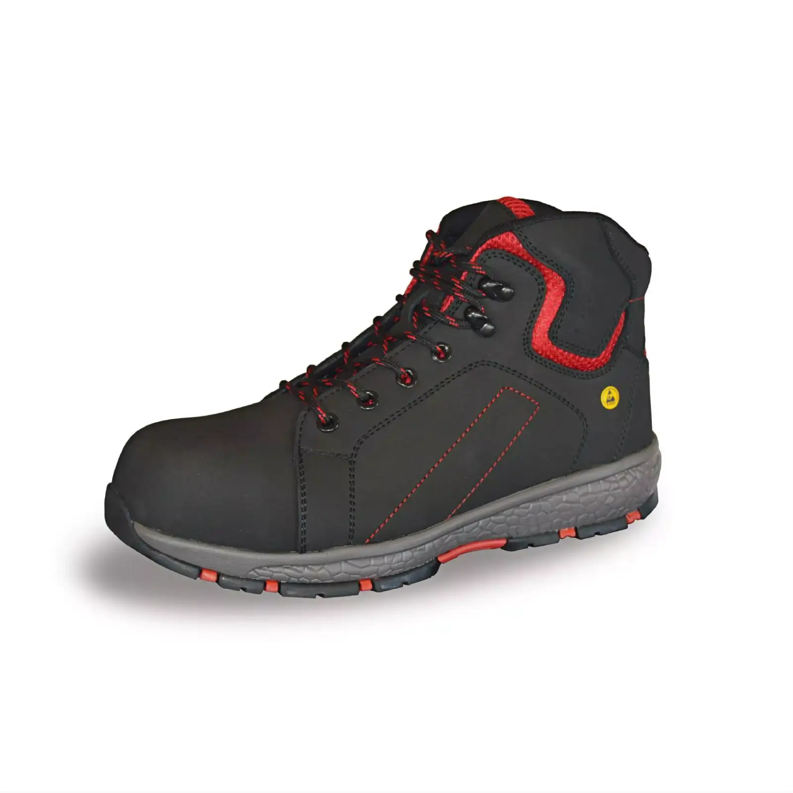 Fabricada em pele preta resistente com acabamentos modernos em vermelho, esta bota combina durabilidade com design profissional. A biqueira em compósito (sem aço) garante proteção contra impactos com menor peso, enquanto a palmilha em Kevlar anti-perfuração oferece segurança total contra objetos cortantes.