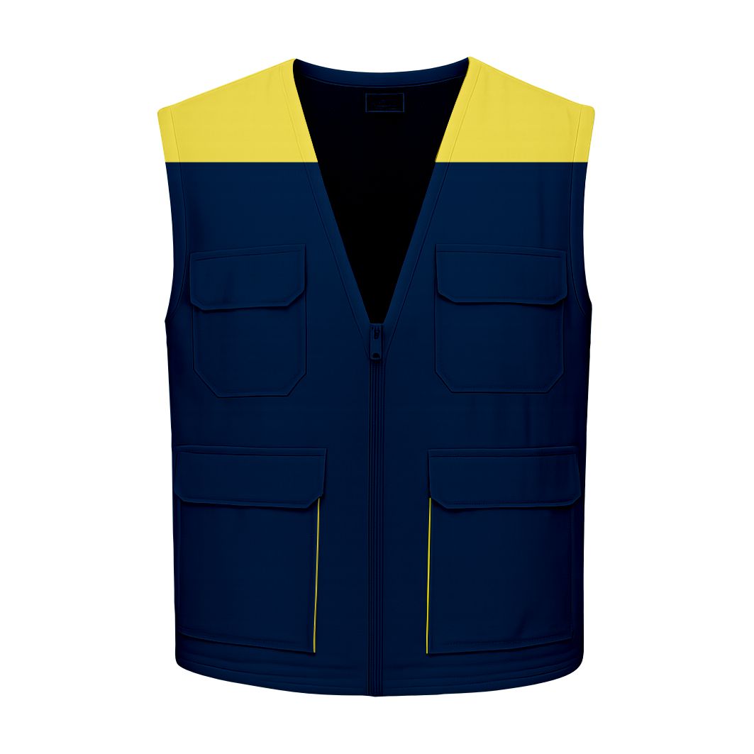 Colete respirável e resistente em sarja com forro em rede, gola em bico e múltiplos bolsos funcionais. Leve, durável e ideal para uso profissional diário.