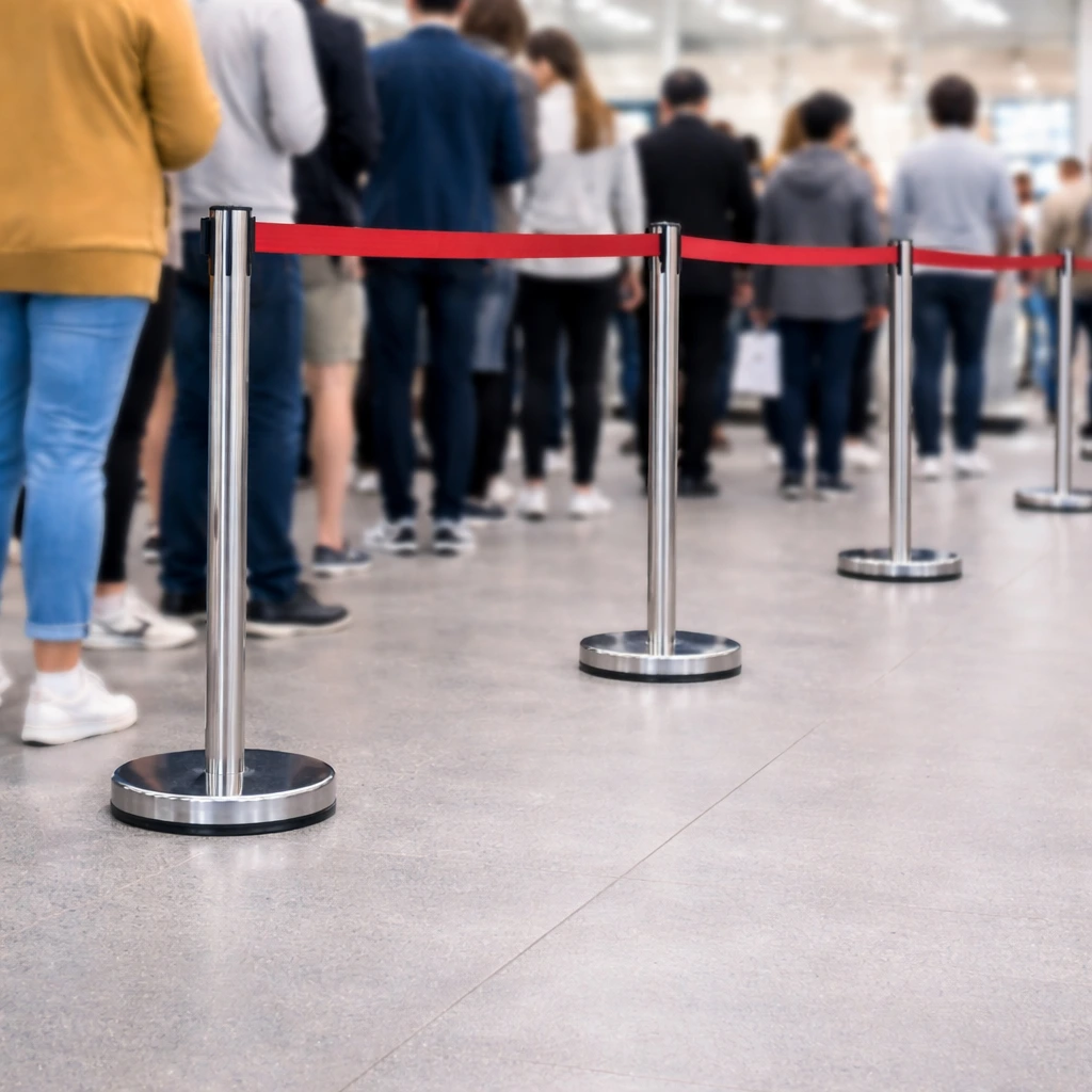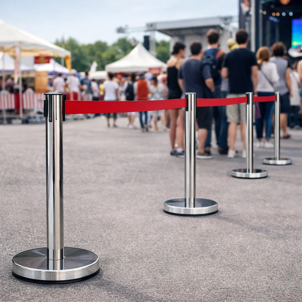 Poste para gestão de filas de pessoas, que é baseado num sistema de cinto retrátil. Cada poste pode ser conectado com outras fitas para configurar a fila. Cada poste tem quatro conexões que permitem a conexão com outros postes utilizando cintas retráteis para gerenciar filas de forma rápida e eficiente.