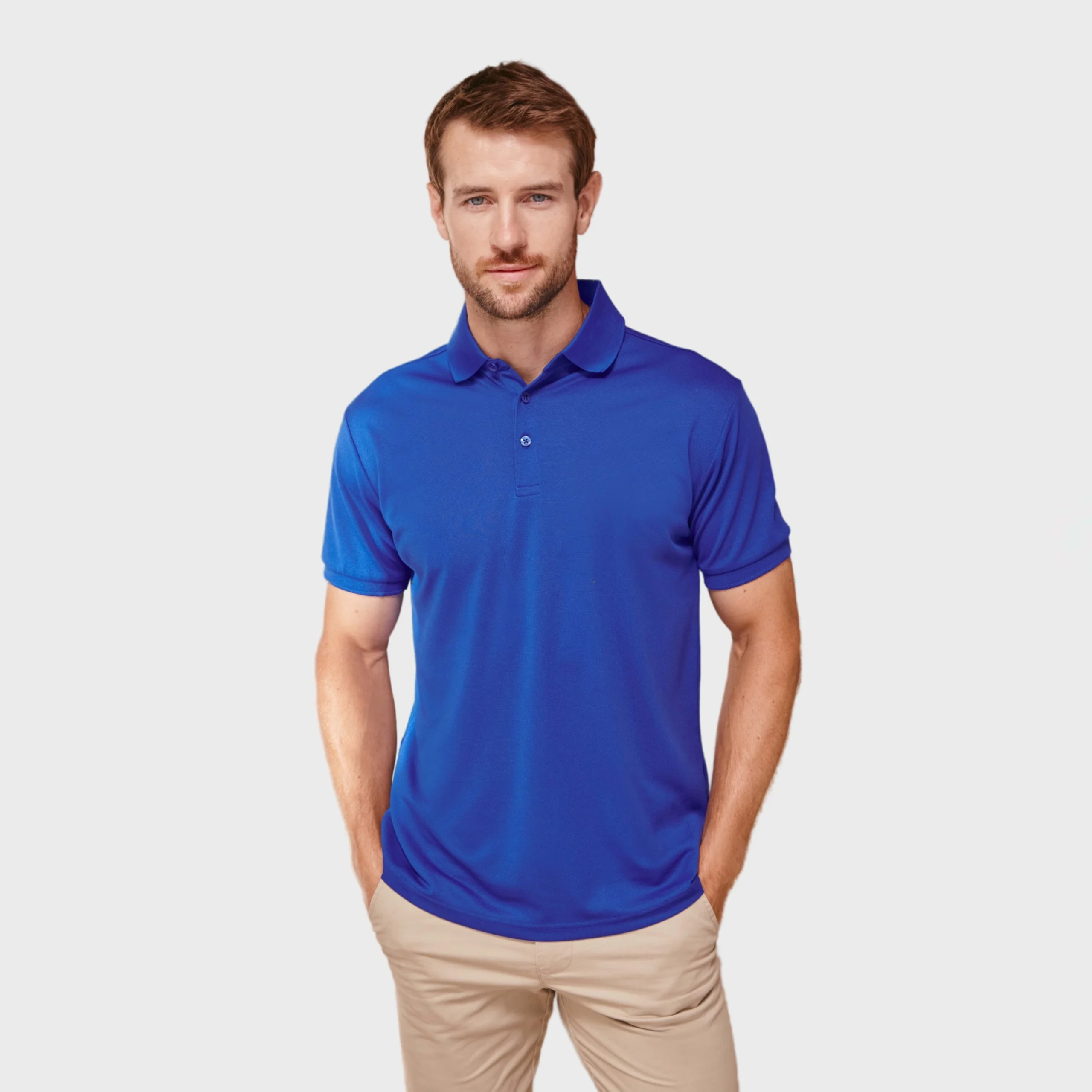 Polo leve e respirável em tecido técnico de secagem rápida, que garante frescura e conforto durante todo o dia.
